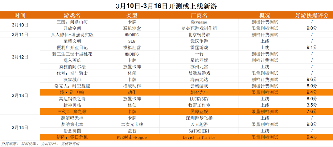 下周上线/测试的新游类型较多,且有三款重要产品,其一是朝夕光年FTG产品《境·界 刀鸣》,其二是三国卡牌赛道头部IP续作《三幻2:枭之歌》,其三是Level Infinite发行PVE+Rogue射击《矩阵:零日危机》。