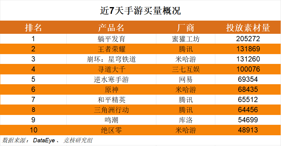 据DataEye数据显示,近7天国内游戏买量榜单中,蜜獾工坊《躺平发育》一骑绝尘,维持较大的买量力度。此外腾讯、网易、米哈游、库洛旗下的旗舰产品仍保持高素材量投放,买量广告基本成为其常态化营销手段,并且均已字节系渠道为主。
