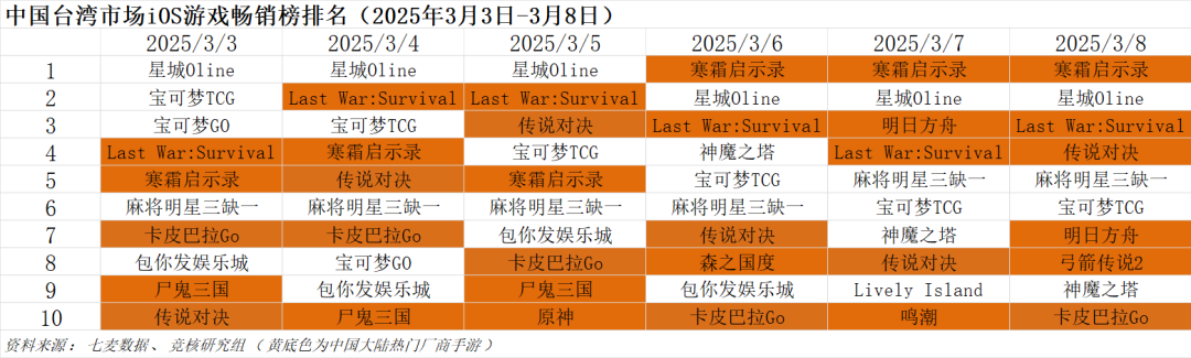 中国台湾市场2025年3月3日—2025年3月8日iOS游戏类畅销榜中,点点互动《寒霜启示录》霸榜3天。