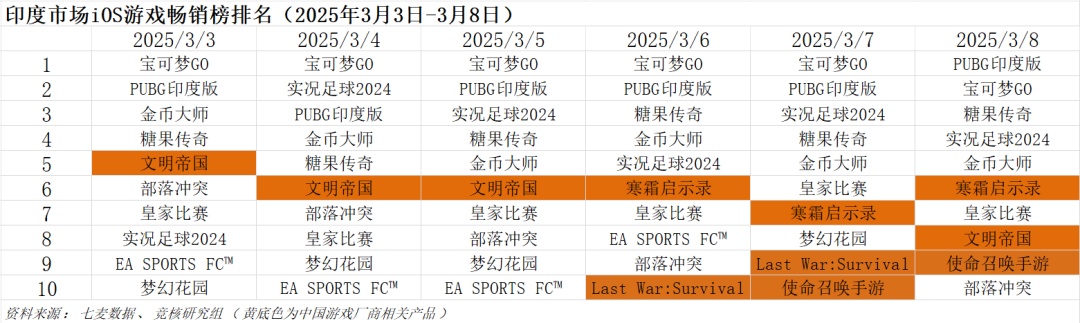 印度市场2025年3月3日—2025年3月8日iOS游戏类畅销榜中,点点互动《寒霜启示录》、TOP GAMES《文明帝国》、Funfly《Last War:Survival》、腾讯《使命召唤手游》进入畅销榜前十。