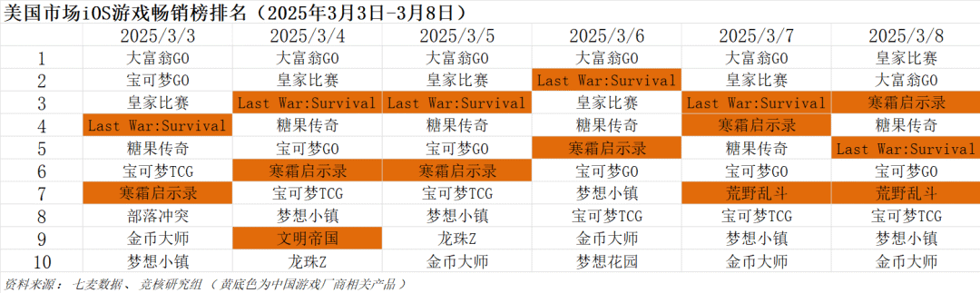 美国市场2025年3月3日—2025年3月8日iOS游戏类畅销榜中,Funfly《Last War:Survival》,点点互动《寒霜启示录》,腾讯《荒野乱斗》,TOP GAMES《文明帝国》进入畅销榜前十。