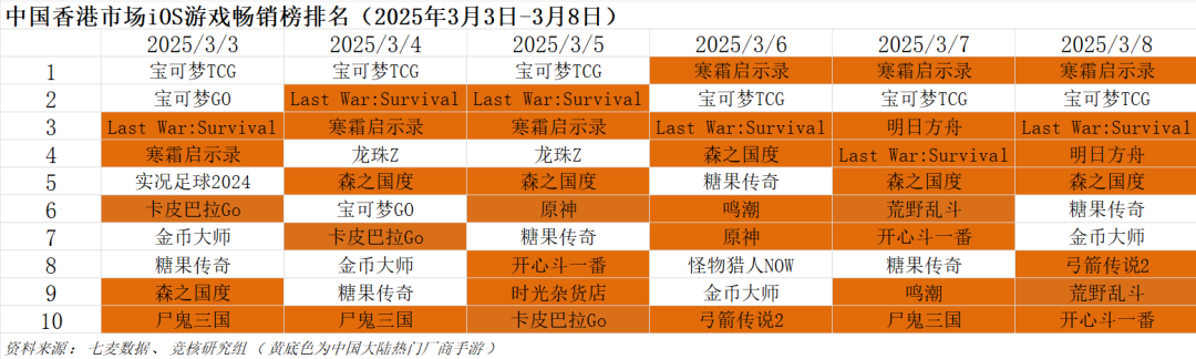 中国香港市场2025年3月3日—2025年3月8日iOS游戏类畅销榜中,点点互动《寒霜启示录》霸榜3天。