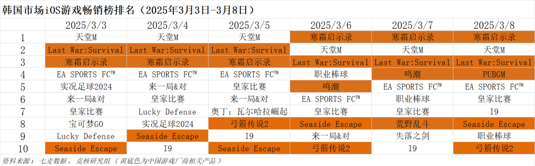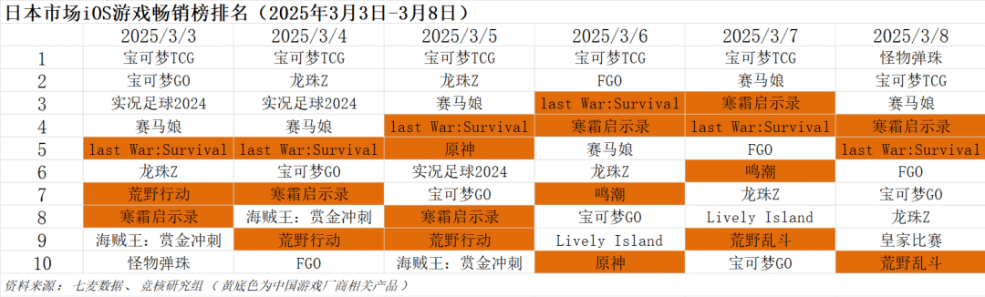 日本市场2025年3月3日—2025年3月8日iOS游戏类畅销榜中,Funfly《Last War:Survival》,点点互动《寒霜启示录》,网易《荒野行动》,米哈游《原神》,库洛《鸣潮》,腾讯《荒野乱斗》在本周进入畅销榜前十。