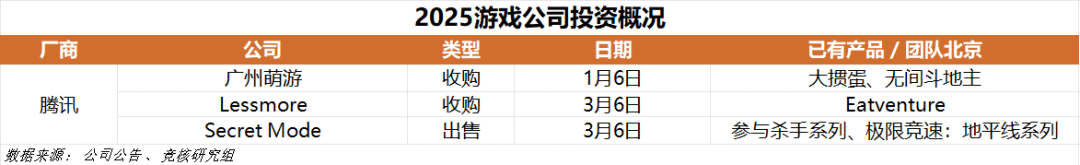 面向游戏投资领域,本周腾讯旗下两大海外游戏子公司曝出了两则消息:一是Miniclip收购了德国混合休闲游戏工作室 Lessmore;二是,Sumo Group将旗下的游戏发行团队Secret Mode出售给英国投资机构Emona Capital。
