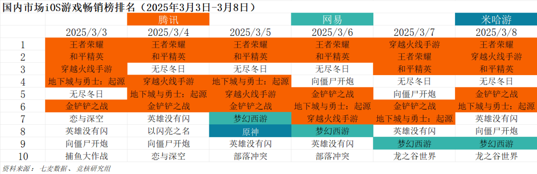 中国大陆市场2025年3月3日—2025年3月8日iOS游戏类畅销榜中,腾讯《王者荣耀》霸榜5天,《穿越火线手游》霸榜1天。