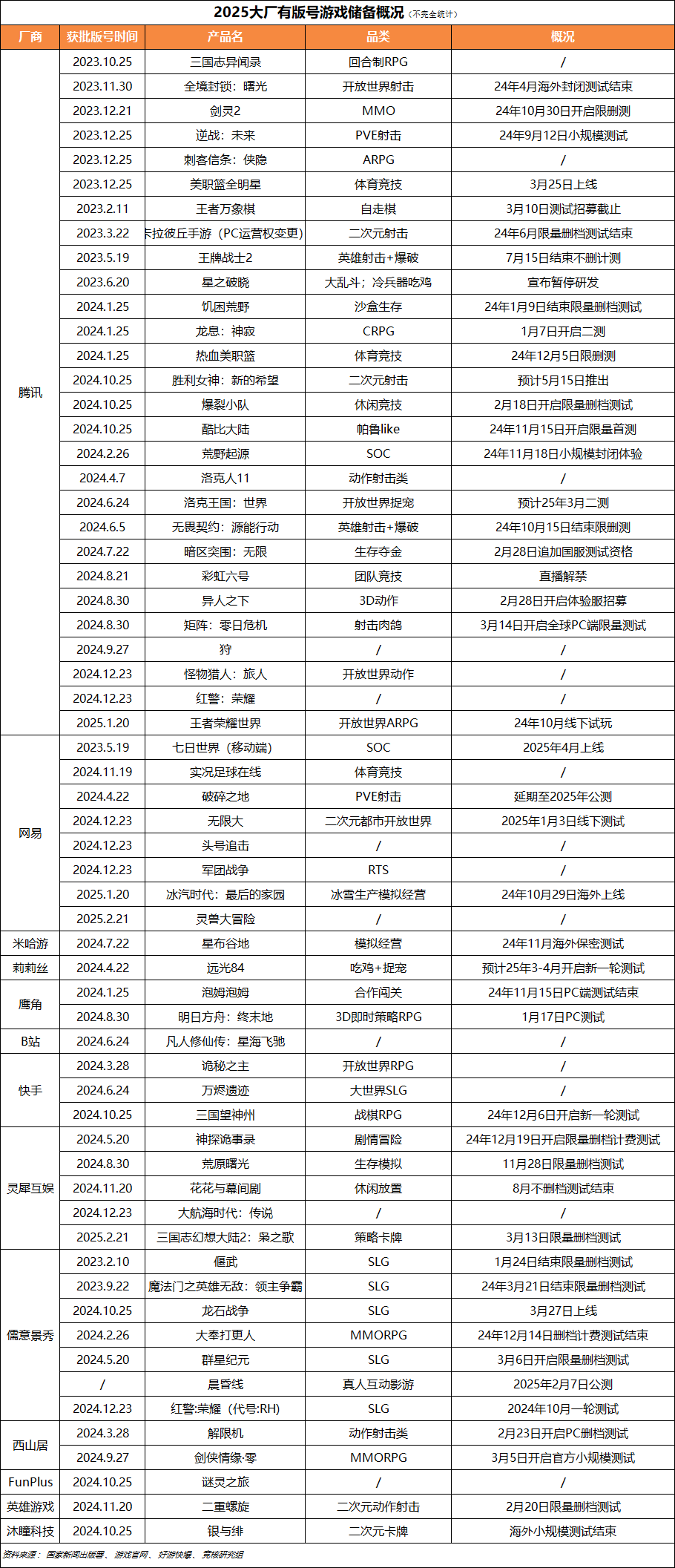 据竞核不完全统计,2025年大厂有版号游戏储备概况如上图,腾讯大约有28款,包括《怪物猎人:旅人》《王者荣耀世界》《胜利女神:新的希望》《爆裂小队》等。