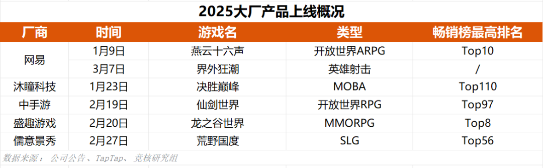 产品上新方面,截至3月9日,2025年大厂上线的重点新品包括网易游戏水滴事业部开放世界ARPG游戏《燕云十六声》手游、沐瞳科技MOBA游戏《决胜巅峰》,以及本月新增的中手游开放世界游戏《仙剑世界》、盛趣游戏的MMO游戏《龙之谷世界》和儒意景秀发行的SLG游戏《荒野国度》。