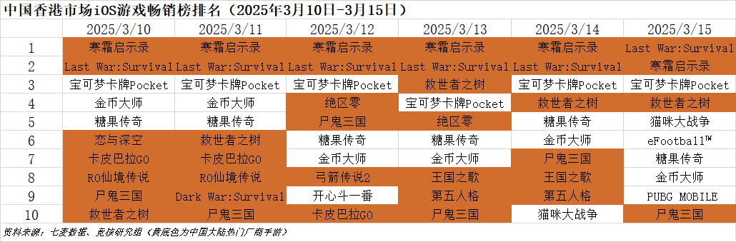 中国香港市场2025年3月10日-2025年3月15日iOS游戏类畅销榜中,点点互动《寒霜启示录》登顶5天、元趣科技《Last War:Survival》登顶1天。