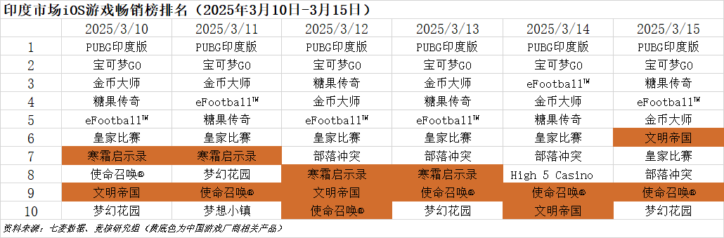 印度市场2025年3月10日-2025年3月15日iOS游戏类畅销榜中,点点互动《寒霜启示录》、TOP GAMES《文明帝国》、腾讯游戏《使命召唤》手游等产品进入畅销榜Top10。