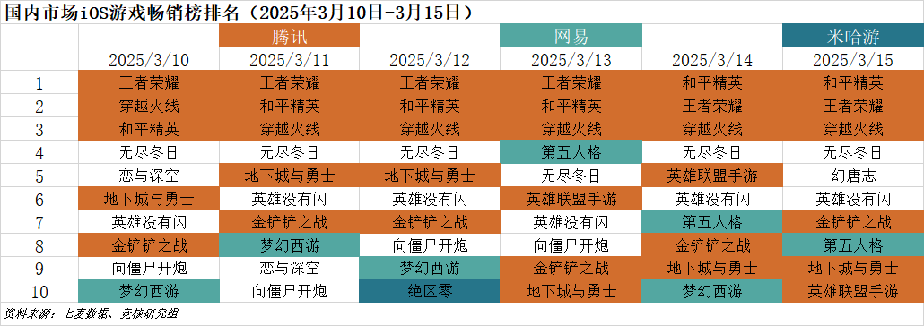 中国大陆市场2025年3月10日-2025年3月15日iOS游戏类畅销榜中,腾讯系产品持续占领畅销榜前三位置,《王者荣耀》霸榜4天,《和平精英》霸榜一天。《地下城与勇士:起源》《英雄联盟手游》《金铲铲之战》《穿越火线》等产品稳定居于前列。