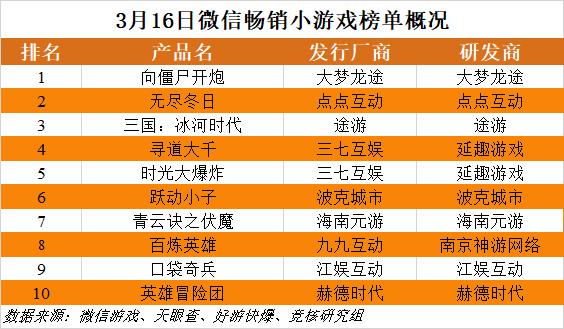 3月16日,微信畅销小游戏前十榜单中,《向僵尸开炮》、《无尽冬日》、《三国:冰河时代》等老面孔依旧领跑。