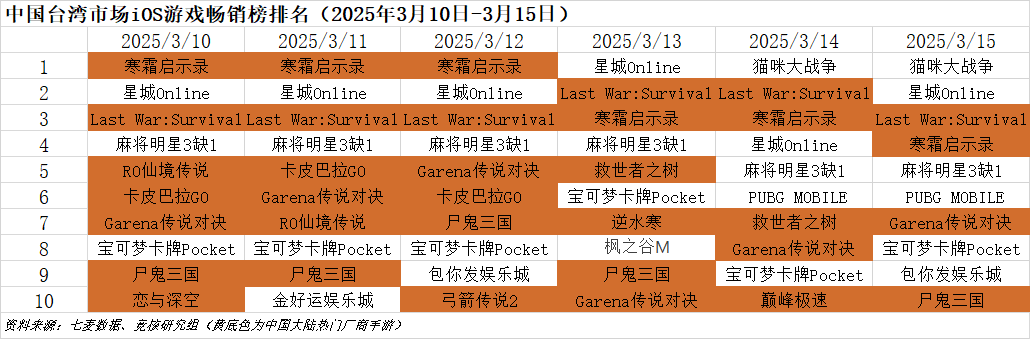 中国台湾市场2025年3月10日-2025年3月15日iOS游戏类畅销榜中,点点互动《寒霜启示录》登顶3天。