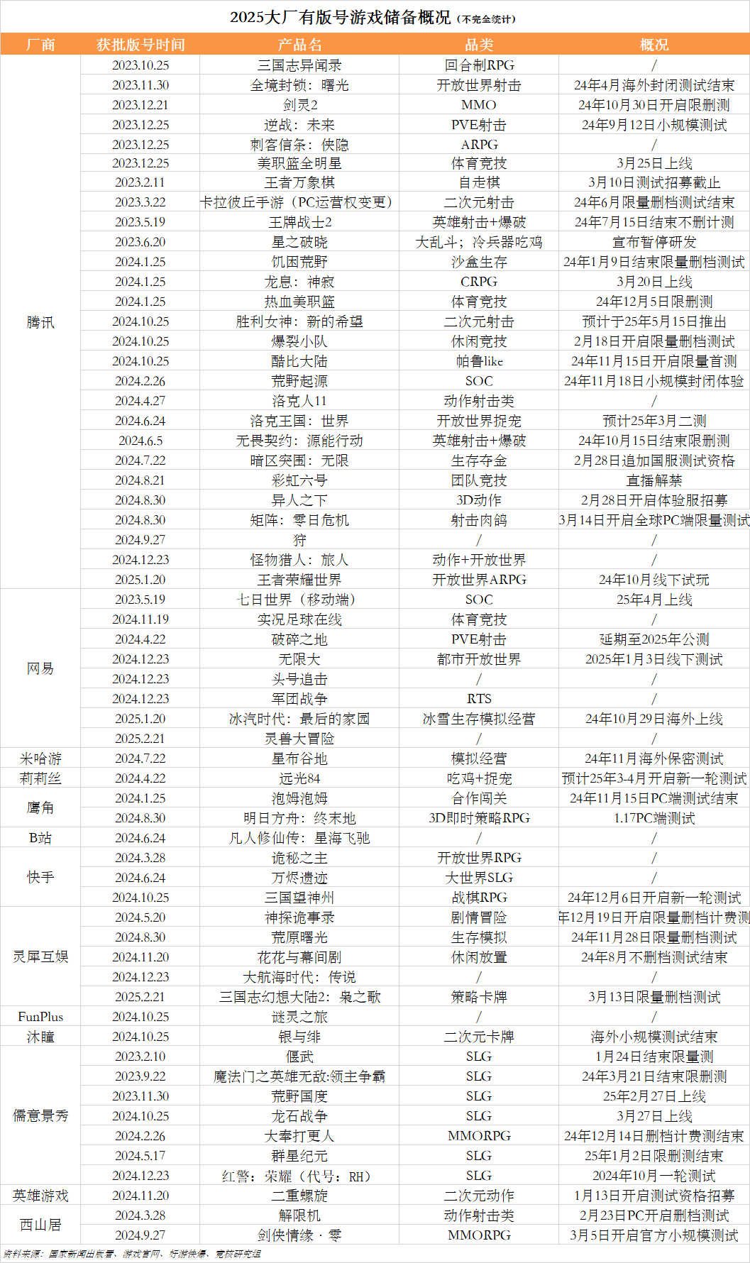 据竞核不完全统计,2025大厂有版号游戏储备概况如上图,腾讯大约有27款,包括《怪物猎人:旅人》《王者荣耀世界》《胜利女神:新的希望》《爆裂小队》等。网易方面大约有8款,包括《无限大》等。