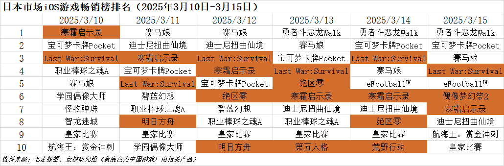 日本市场2025年3月10日-2025年3月15日iOS游戏类畅销榜中,点点互动《寒霜启示录》登顶1天。元趣科技《Last War:Survival》、鹰角《明日方舟》、米哈游《绝区零》、网易《第五人格》《荒野行动》、乐元素《偶像梦幻祭2》等产品有着不错表现。