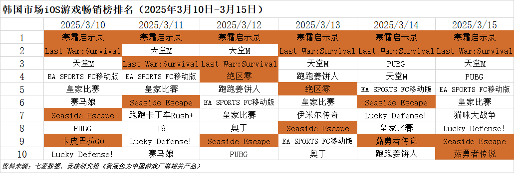 韩国市场2025年3月10日-2025年3月15日iOS游戏类畅销榜中,点点互动《寒霜启示录》登顶6天。
