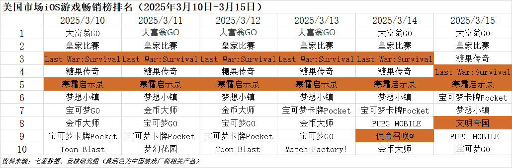 美国市场2025年3月10日-2025年3月15日iOS游戏类畅销榜中,元趣科技《Last War:Survival》、点点互动《寒霜启示录》、腾讯游戏《使命召唤》手游、TOP GAMES《文明帝国》等产品进入畅销榜Top10。