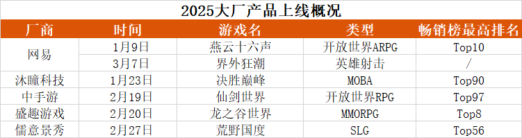 产品上新方面,截至3月16日,2025年大厂上线的重点新品包括网易游戏水滴事业部开放世界ARPG游戏《燕云十六声》手游、英雄射击产品《界外狂潮》,沐瞳科技MOBA游戏《决胜巅峰》,以及本月新增的中手游开放世界游戏《仙剑世界》、盛趣游戏的MMO游戏《龙之谷世界》和儒意景秀发行的SLG游戏《荒野国度》。
