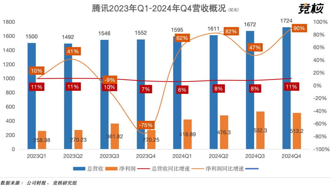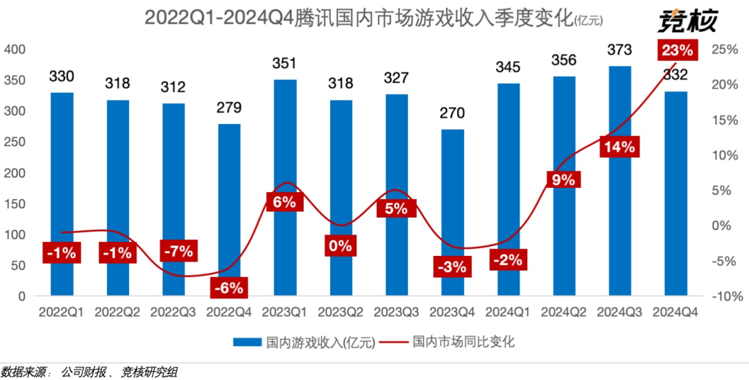 根据本期财报显示,2024年Q1-Q4腾讯游戏业务实现稳步增长趋势。其中,Q4公司本土游戏业务同比增速进一步提升至23%,单季收入332亿元。