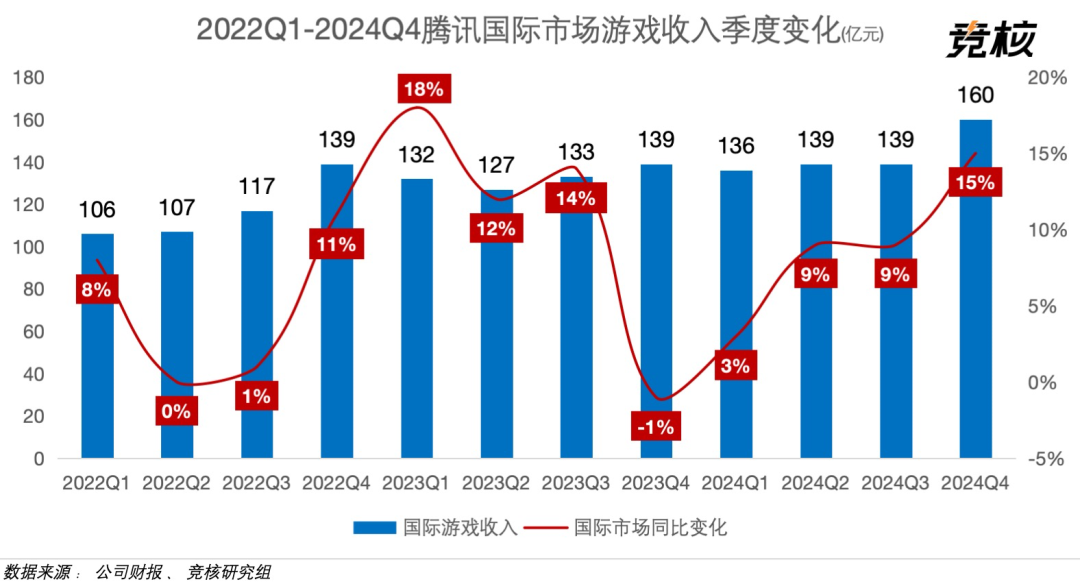 根据竞核统计,去年四个季度,腾讯游戏国际游戏业务也保持着较为稳定的增长。Q4期间,公司国际游戏业务同比增速一度达到15%,营收160亿元,刷新季度收入高点,接近本土市场收入的一半。相关业务全年同比增长9%至580亿元,在腾讯游戏中保持三成左右的稳定占比。