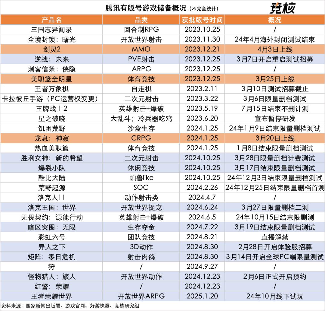 据竞核不完全统计,去年腾讯游戏大约上线了12款新游戏,包括《白荆回廊》、《地下城与勇士:起源》、《极品飞车:集结》、《世界启元》、《三角洲行动》、《宝可梦大集结》、《航海王壮志雄心》等。