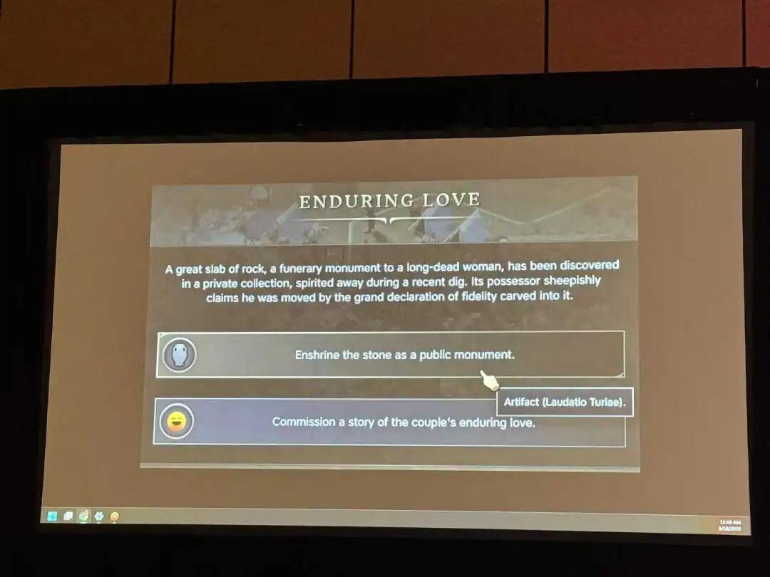 除了原始游戏数据和翻新建筑之外,事实证明,先前触发的叙事事件和叙事标签也能和考古学机制所结合,完成叙事事件。比如游戏中的“Enduring Love”事件既和玩家此前的选择有关,也与文物“Laudatio Turiae”相关联。