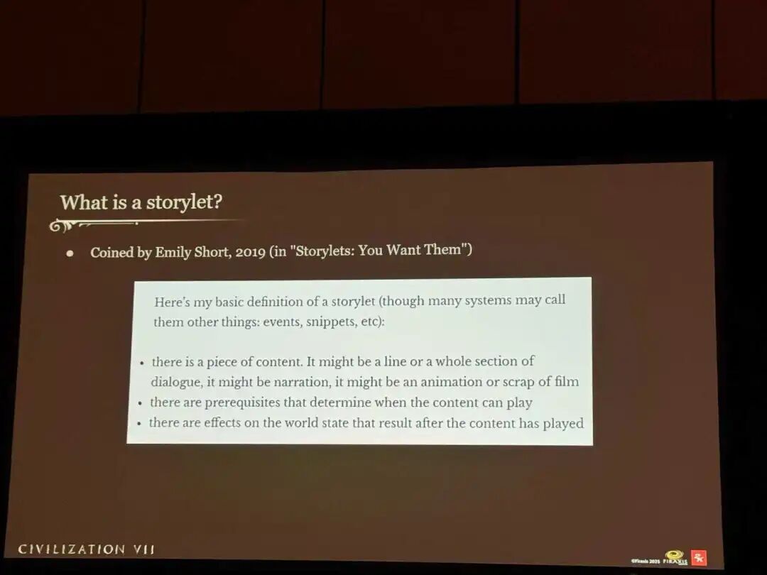 Cat Manning认为,故事需要“storylet”。“storylet”的概念是Emily Short在2019年提出的,“storylet”的定义如下图,它可能是一行或一整段对话,也可能是叙述,还有可能是一段动画或电影片段,它包含着决定内容可以播放的先决条件,这段内容播放后会对世界状态产生影响。