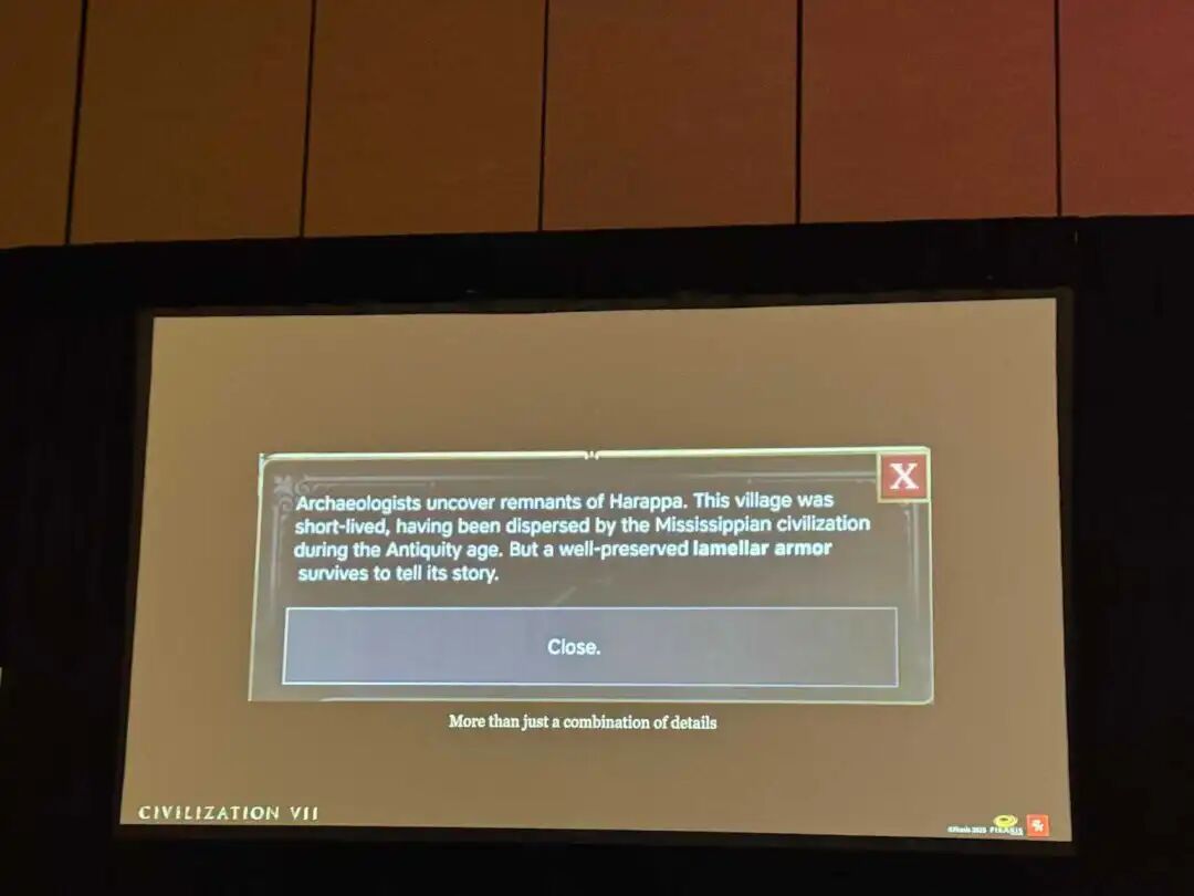 如同上图,在《文明 VII》中,挖出盔甲想传达的不仅仅是:“这是你发现的,你准备怎么做?”,而是Harappa遗迹在这里的兴衰存亡,尽管已成历史,但它存在的正当性和现在的文明别无二致。他们想要做的是及时定位这个发现,并讲述它的故事。这是他们赋予盔甲重要性的原因,也是这个盔甲作为文物值得保存的原因。