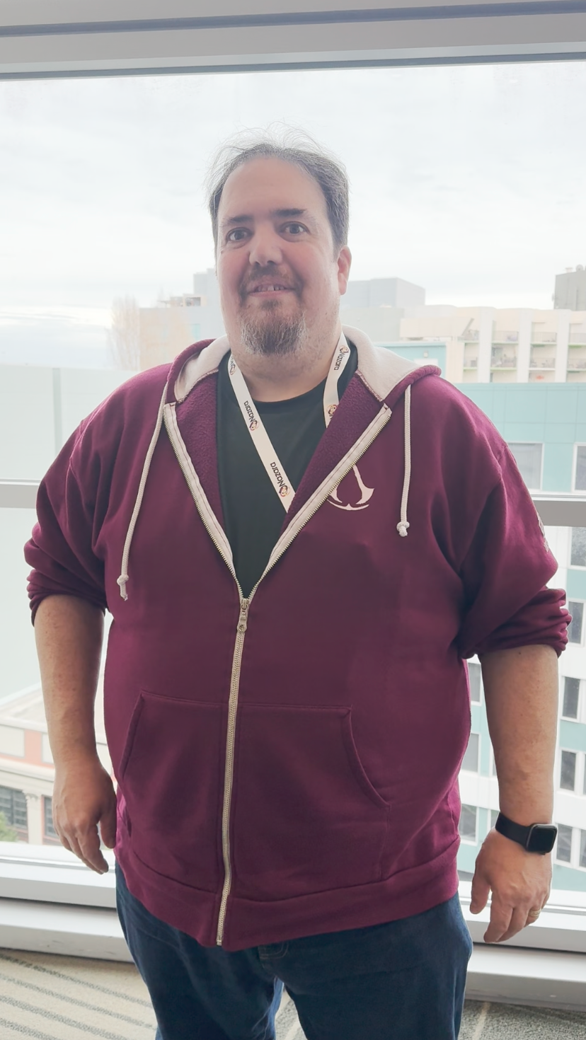 演讲结束后,竞核采访到了育碧音乐总监Jerome Angelot。他从2005年就加入育碧,参与过《金刚》、《雷曼:疯狂兔子》、《刺客信条》系列、《孤岛惊魂》系列等多部作品的音效和音乐设计。