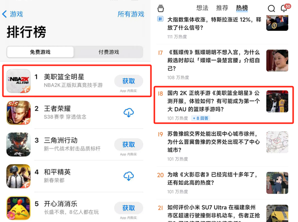 这种分野背后,是核心玩家与泛玩家受众的分化:前者追求战术复刻与数据拟真,后者渴望自由表达与低门槛爽感。当市场上缺乏能兼顾两大圈层的产品时,《NBA2K All Star》的入局显得尤为关键。游戏上线首日,登顶了国区AppStore免费榜。甚至在知乎热榜上,也出现了《NBA2K All Star》能否会成为第一个大DAU篮球手游的热门议题。