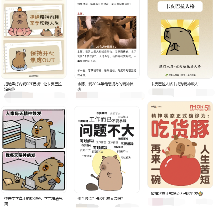 不过,角色人格化并不意味着角色要有完整设定,也可以只有一两个人类特质,让消费者从中得到情感共鸣。就像之前爆火的卡皮巴拉,因为钝感力和松弛感,被生活高压之下频频“发疯”、“阴暗爬行”的年轻人视作精神导师,狠狠火了一把。