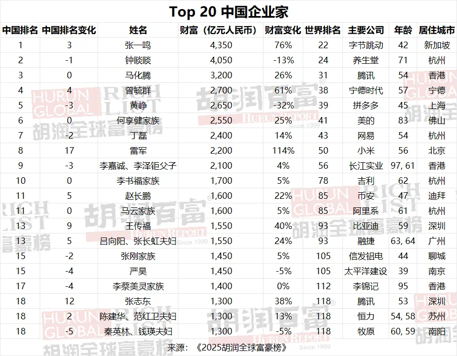 和去年相比,两人在《2025胡润全球富豪榜》的排名都基本维持稳定,个人财富总额均有所增长,尤其是马化腾,虽然整体排名变化不大,但财富增长了660亿元,成为中国富豪里财富增长第四多的人。