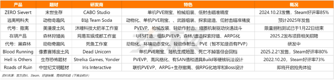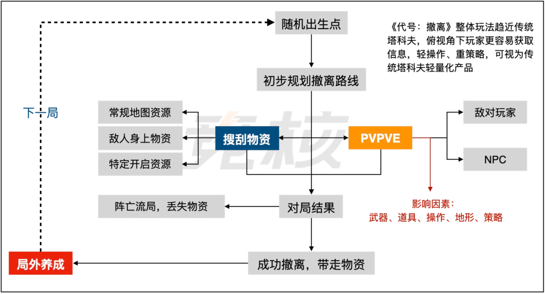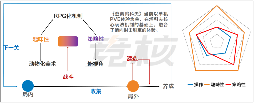 都说塔科夫like是当前射击赛道乃至游戏行业的风口,从市场情况来看,也确实如此。 在《逃离塔科夫》《暗区突围》《和平精英-地铁逃生》《三角洲行动》《萤火突击》等热门产品外,目前包括腾讯、网易、Supercell、蓝洞等国内外大厂均还在继续深挖“搜打撤”玩法的潜力。 就比如,刚刚曝光由前任暴雪CEO Mike Morhaime等老暴雪人打造的太空盗贼题材PvEvP射击《无主星渊》,Supercell前不久冷启动的卡通海盗主题轻度搜打撤《Boat Game》,蓝洞升级迭代的“立体战场”版塔科夫like《Project Black Budget》,以及腾讯超自然题材夺宝撤离《代号:日蚀》与武侠ACT+搜打撤《代号:SN》(雪中悍刀行IP改编)等。 不过,抛开这类基于“搜打撤”核心玩法机制,围绕玩法融合、题材创新的塔科夫like新作外,目前有一些厂商尝试以“3C”作为切入口,主打俯视角生存撤离射击产品。 当中包括B站Team Soda工作室的动物奇趣风单机PvE射击《逃离鸭科夫》、沐瞳科技大肥羊工作室美漫废土风PvEvP射击《代号:撤离》,以及网易互娱成都工作室在研的UE5森林狩猎ARPG类塔科夫like产品等。 提起“俯视角塔科夫like”,近段时间竞核与多位欧美游戏从业者交流时,他们也表达出了较大兴趣,甚至有不少人较为看好这一产品方向。与此同时,据竞核不完全统计,当前国内外已经有不少团队在PC端或移动端布局俯视角塔科夫like产品。 B站走动物化趣味之路,未来可能往MMO方向靠 既然被称为“俯视角塔科夫like”,那么其在核心玩法机制上还是基于“搜打撤”。当前Team Soda、大肥羊工作室和死鱼工作室等已经曝光的相关产品,均是如此。 与此同时,这类游戏在设计上都有一个共性,即“高全局信息获取能力+低射击精准度”。而它们的差异化更多是体现在,题材、单机or联机、PvE与PvP占比以及镜头角度等方面。 就好比《逃离鸭科夫》(简称:鸭科夫),从游戏名字上我们就能猜出,这是一款致敬《逃离塔科夫》的产品。Team Soda制作人“游戏学徒Jeff”(陈建烽)曾公开表示,最初制作这款游戏,就是因为其本人喜欢《逃离塔科夫》。此外,游戏对于瞄准精度要求较低,只需右键定位到敌人即可。 《逃离鸭科夫》低射击精准度演示 不过,在看到该作具体内容后,我们或多或少会对游戏有另一种“眼熟”。《鸭科夫》在美术风格上,可以看到同样出自Jeff之手的《碳酸危机》《蛇形武装》等作品的影子。 相比传统军武或战争题材塔科夫,《鸭科夫》美术风格更具趣味性。游戏中的角色、NPC形象均为近似鸭子的尖嘴鸟类生物。在感官上,更容易让玩家获得一种充满趣味且没有压力的体验。 《鸭科夫》最大的不同点在于,游戏玩法并非塔科夫like标准的PvEvP模式,而是类似射击刷宝的单机PvE。玩家在游戏中的大致体验流程为:地图探索、搜集、PvE——>传送点撤离——>局外养成(技能Build、装备和道具打造、基地建造)——>下一关卡/任务挑战。 需要提出的是,《鸭科夫》趣味休闲的外表下,其实也有着不简单的玩法内核。例如,类似魂游的“跑尸”机制(玩家可以重新捡回遗失的物资);枪械有“受损度”设定(受损80%及以上时散射严重)。这些机制设计,在一定程度上提高了游戏的容错率和复玩性。 此外在游戏中,玩家生存有能量、水分等SAN值条件(影响HP和视野范围);除开武器数值,游戏中也有着掩体阻挡等设定。要言之,《鸭科夫》操作简单、题材有趣,但玩家要想玩好,其实对于局外构筑、局内策略都有着一定的熟练度要求。 《逃离鸭科夫》中的掩体影响 考虑到游戏还处于研发测试前期,《鸭科夫》多少存在一些有待优化的地方,例如掩体高低视觉差、武器射程与衰减度信息不明确、部分掉落点物资固化等。 值得提出的是,在美术风格、趣味与玩法平衡上有着类似思路的,其实并不止B站Team Soda工作室一家。死鱼工作室在研的类逃离塔科夫俯视角TPS冒险游戏《代号:黑森林》,在角色形象设计上也采用了动物化。 《代号:黑森林》对外展示图 而在玩法机制设计方面,《代号:黑森林》则通过环境动态变化,来增强游戏的丰富性和挑战性。例如,黑森林地图的昼夜、季节、气候都会不停切换,环境状态对角色行为和资源有影响(比如雨后长出蘑菇,雷暴后长出照明雷木等)。 此外,根据Jeff对塔科夫like的看法,联机合作PvE类塔科夫应该是一个不错的方向。它可能有点类似MMO,玩家在前期以打钱发育为主,后期合作打本或加入一些PvP对抗。而《鸭科夫》当前之所以主打单机PvE,一方面在于成本问题,另一方面团队想先做好单机体验。 沐瞳轻操作、重策略,更趋向休闲竞技+PvE刷宝 相比《鸭科夫》在PC端主打更广阔视野战斗、更趣味性的表达,沐瞳科技大肥羊工作室《代号:撤离》早期在移动端则选择了相对逼仄视野、房间式地图和更硬核机制的设计。 不过,就游戏在今年1月份的测试内容来看,相比去年8月首测《代号:撤离》针对“高全局信息获取能力”似乎做了进一步调整。游戏的摄像头被拉的更高、更远,视野覆盖范围更广,墙体的压迫感没有那么强。整个游戏视角、界面设计,更趋向一款俯视角组队刷宝RPG产品。 《代号:撤离》局内场景与战斗演示 而在游戏核心玩法上,竞核认为《代号:撤离》更接近传统塔科夫。一方面,游戏局内主打“搜打撤”,有背包格子、检索搜东西、等级装备区分,战斗包括PvE和PvP;另一方面,游戏局外有着枪械改装