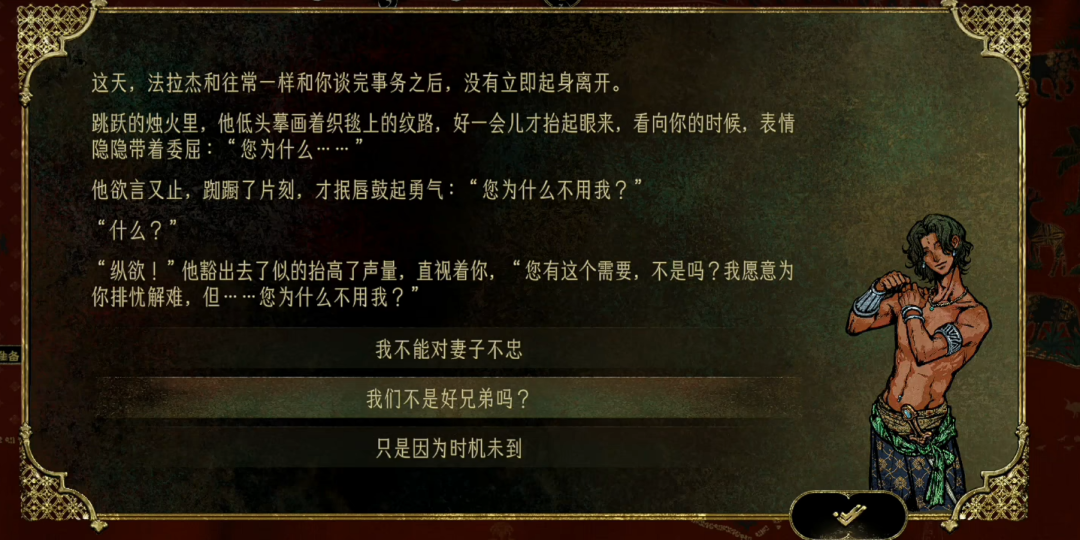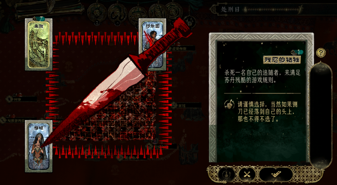 游戏中还存在着大量残忍的抉择。比如笔者在游玩过程中,便曾由于杀戮卡始终没有出现相应的事件,最终不得不杀掉自己妻子来完成任务,还有一轮曾将养女献祭给邪教徒以获得资源,又或者面对苏丹索要角色时,不得不将自己的女性角色奉上以求安稳。