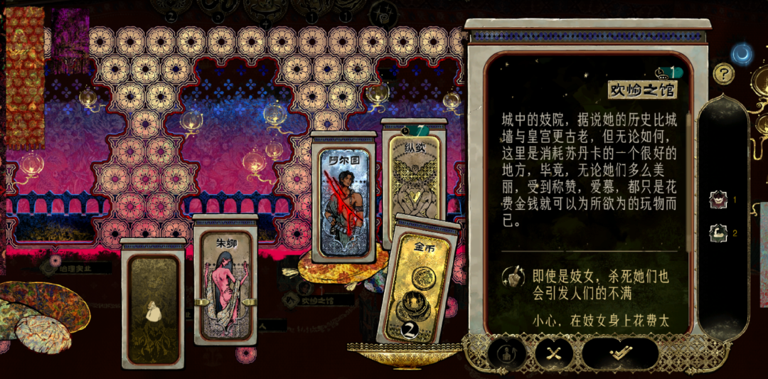如何管理角色的发展,如何合理使用“苏丹卡”,达成自己的目标,例如用杀戮卡杀死反对自己的人。如何分配角色本回合行动内容,如何提升权力等数值,都比最后迫不得已献上妻子更加重要。