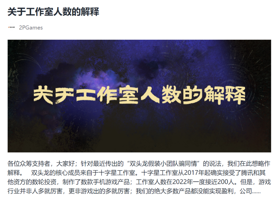 游戏发行商2PGames在今天也是发表了“关于工作室人数的解释”一文,用以回应玩家对厂商是否是独立游戏厂商,工作室人数,游戏开发过程等问题的疑问。