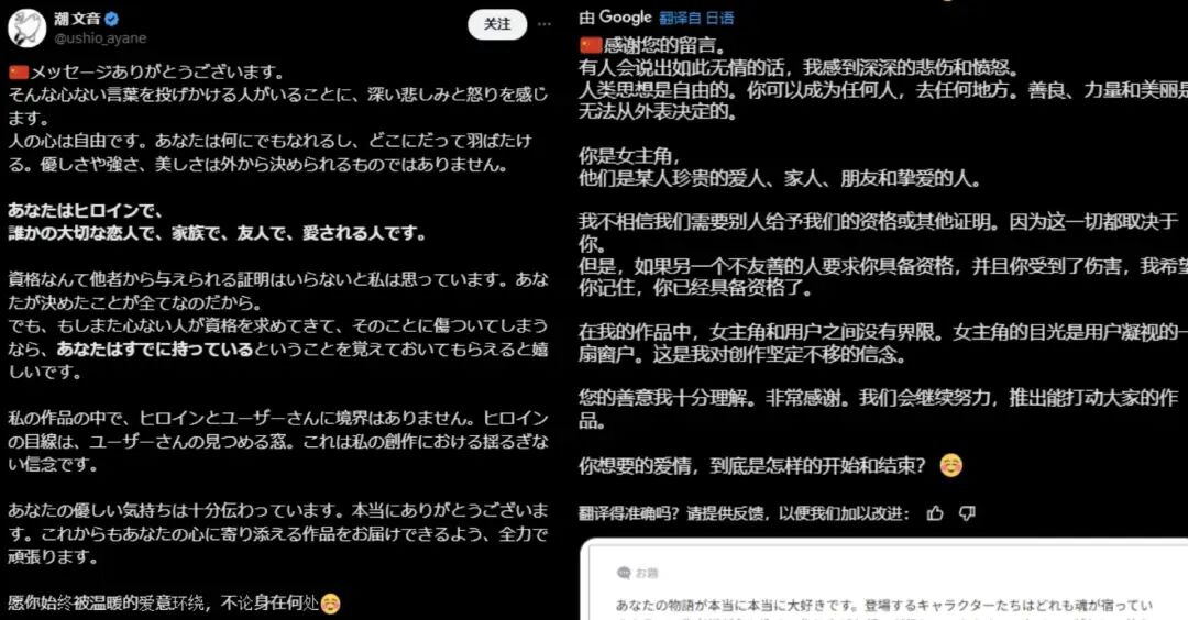 潮文音的回复十分温柔,肯定了玩家拥有成为女主角的资格,表示女主和玩家之间没有界限,最后还专门用中文祝福了图上这位玩家:“愿你始终被温暖的爱意环绕,不论身在何处。”
