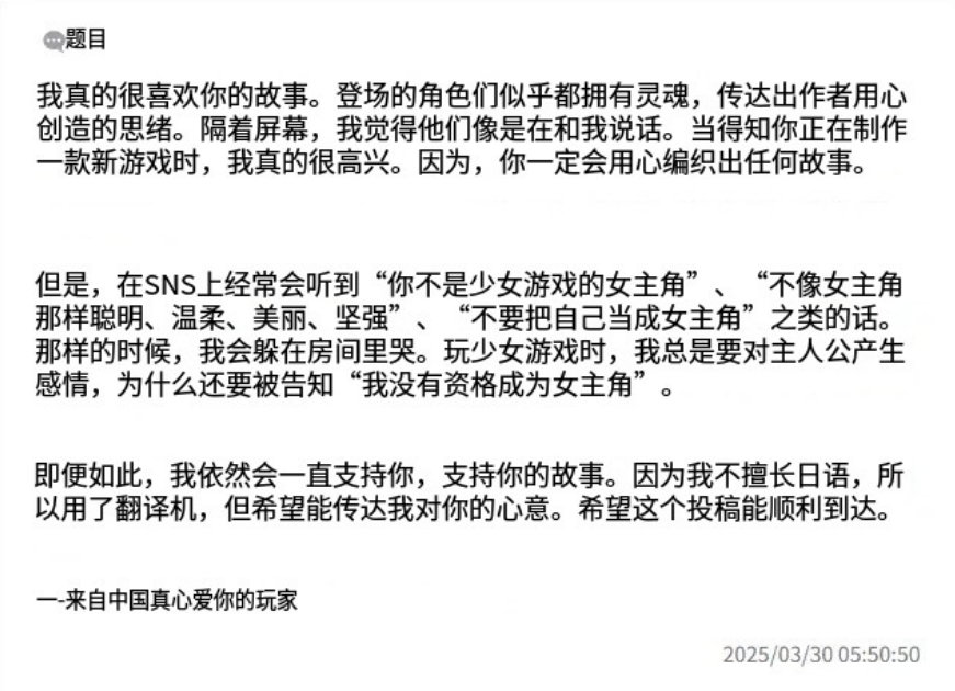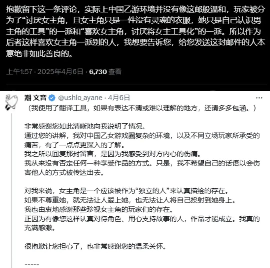 4月5日,潮文音公开回复了一封来自中国玩家的信。在这封信里,玩家诉说了自己内心的苦闷,她总是在社媒上听到“你不配当乙游女主”之类的话,因此觉得伤心。