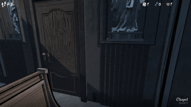 比如上图中展示的就是一个相对典型的选择,最左边的食品贮藏室(Pantry)只有一条通路,可获取4枚金币,一般也会有可恢复少量步数的水果一个;中间的小教堂(Chapel)有两条通路,但是每次经过这个房间都要损失1个金币;右边的车库(Garage)可获取三把钥匙,但并无通往城堡内其他房间的门。