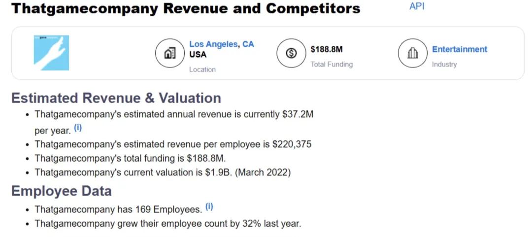 根据分析平台Growjo 数据显示,2022年Thatgamecompany获得美国TPG、红杉资本等机构投资后,投后估值达到19亿美元。要言之,网易游戏这笔投资,获得的回报接近20倍。