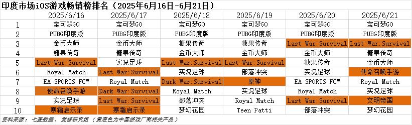 印度市场2025年6月16日—2025年6月21日iOS游戏类畅销榜中,点点互动《寒霜启示录》、TOP GAMES《文明帝国》、Funfly《Last War:Survival》《Dark War:Survival》、腾讯《使命召唤手游》进入畅销榜前十。