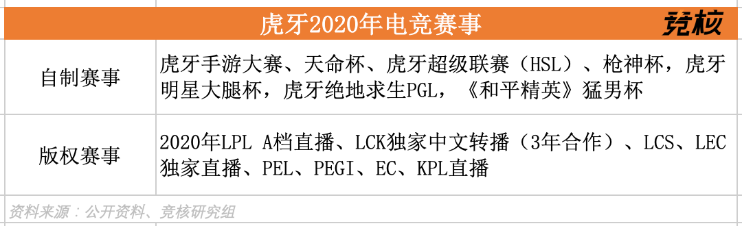 虎牙目前已与超过140个电子竞技组织合作,直播或主办了LCK、LPL、NEST、虎牙天命杯、虎牙手游电竞大赛等多种高规格电竞赛事。