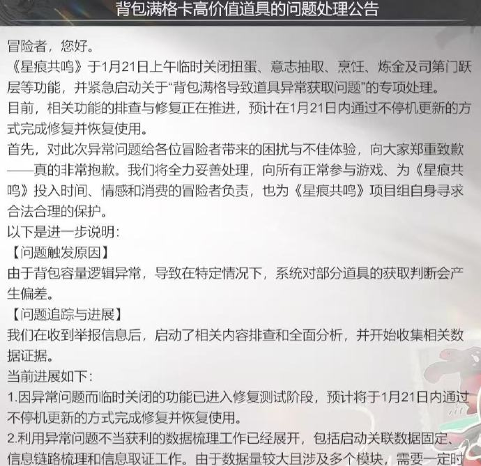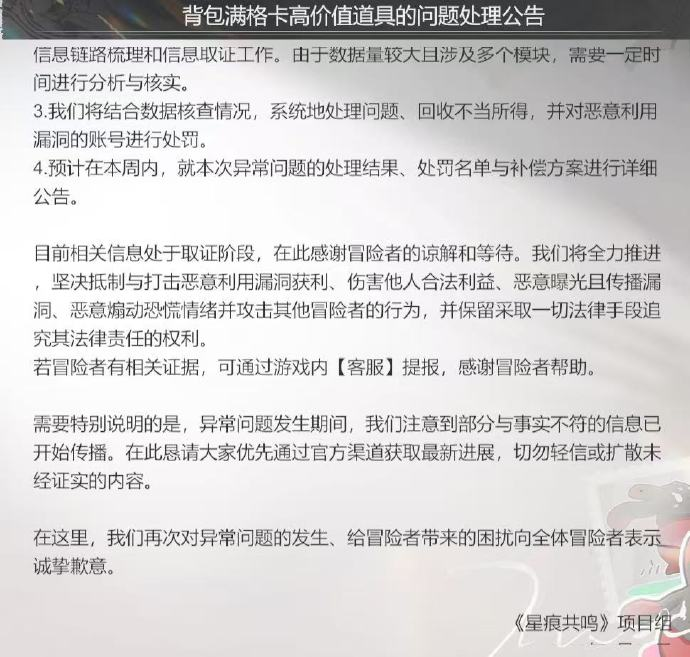 星痕共鸣突发恶性BUG官方紧急回应