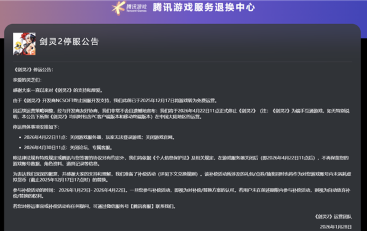 竞核1月28日消息,《剑灵 2》国服将于4月22日正式停运:今日,腾讯游戏《剑灵 2》发布国服停运公告,称因运营策略的调整,游戏将于2026年4月22日11点正式停止在中国大陆地区的运营,停运后玩家账号数据、角色道具等信息将全部清除。同时,官方将在1月29日至4月22日开启补偿活动,兑换玩家未消耗的虚拟货币。