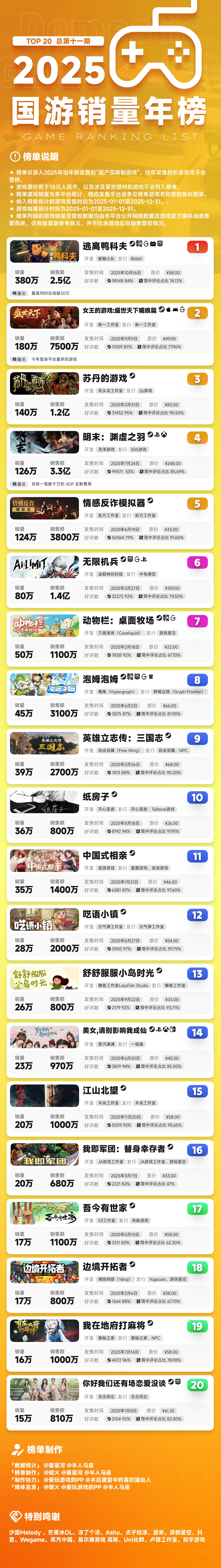 竞核1月29日消息,2025年5款国产单机破百万销量:今日,国游销量榜正式发布了2025年国游销量年榜,由B站发行的《逃离鸭克夫》以380万份的销量领跑2025,《盛世天下》和《苏丹的游戏》分别以180万份和140万份的销量位居第二、第三名。而去年同样有较高话题度的《明末:渊虚之羽》和《情感反诈模拟器》也都突破了百万销量。这也是首次有5款在同一年发售的国产单机游戏均突破百万销量。