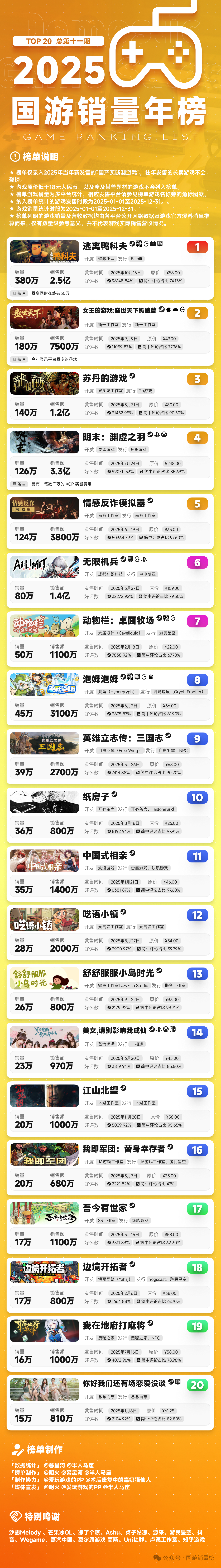 2025年国游销量年榜公布,《逃离鸭科夫》以380万销量、2.5亿销售额登顶榜首。