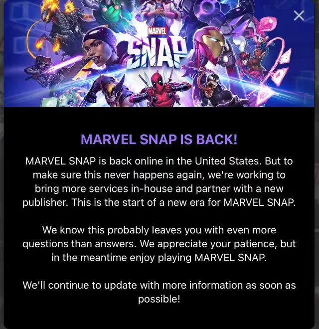 同时《Marvel Snap》的开发商 Second Dinner 通过官方声明表示,为避免类似情况再次发生,公司计划将“更多服务内部化”,并“与新的发行商合作”。这一消息也在游戏内的公告中得到确认。