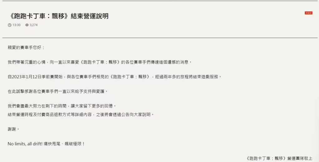 跑跑卡丁车漂移宣布停运