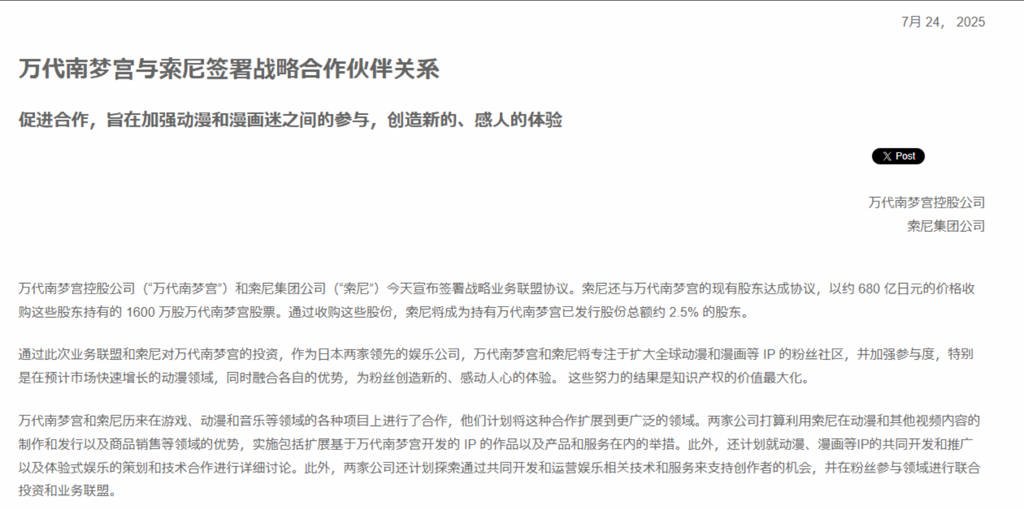 竞核7月24日消息,索尼与万代南宫梦于今日宣布,双方已签署战略业务合作协议。索尼将以680亿日元收购万代南梦宫1600万股,收购完成后,索尼将持有万代南梦宫已发行股份总数约2.5%的股份。索尼表示:“通过此次合作,我们力求与万代南梦宫集团携手,共同打造一系列超越期待的内容和体验,将‘感动’传递给更多粉丝。”