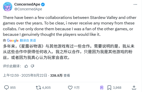 《星露谷物语》开发者在社媒发声,他表示,多年来,《星露谷物语》与其他一些游戏之间有过一些合作,他从未从这些合作中收取任何费用。他之所以和这些游戏合作,只是因为自己是这些游戏的粉丝,或者是因为他觉得玩家们会喜欢。