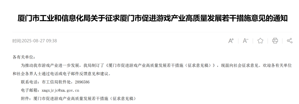 竞核8月27日消息,厦门支持布局AI原生游戏:今日,厦门市工业和信息化局近日发布了《厦门市促进游戏产业高质量发展若干措施(征求意见稿)》(以下简称《措施》)。《措施》提到,要推动全产业链发展,健全保障支撑体系,打造友好发展环境。涉及到AI原生游戏、游戏出版与发行、游戏IP跨界融合、游戏出海、融资支持、游戏开发者生态培育等多个领域。